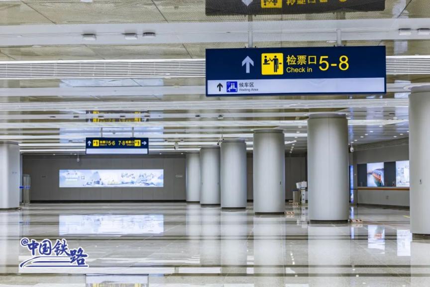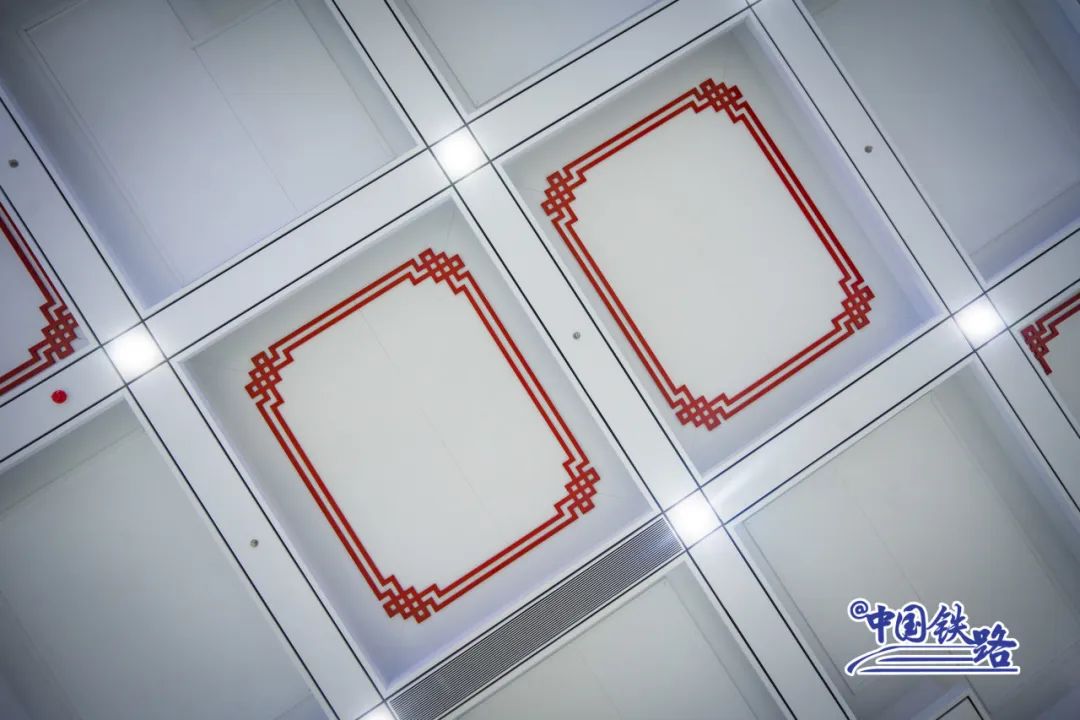 该站候车厅天花板大宗收受镜面不锈钢板和发光天棚组合式装修,部分侧墙面模拟高铁列车的涂装,收受了银灰、深灰和红色的组合搭配,充分展现铁路车站洞开、温馨、亮堂的性情。