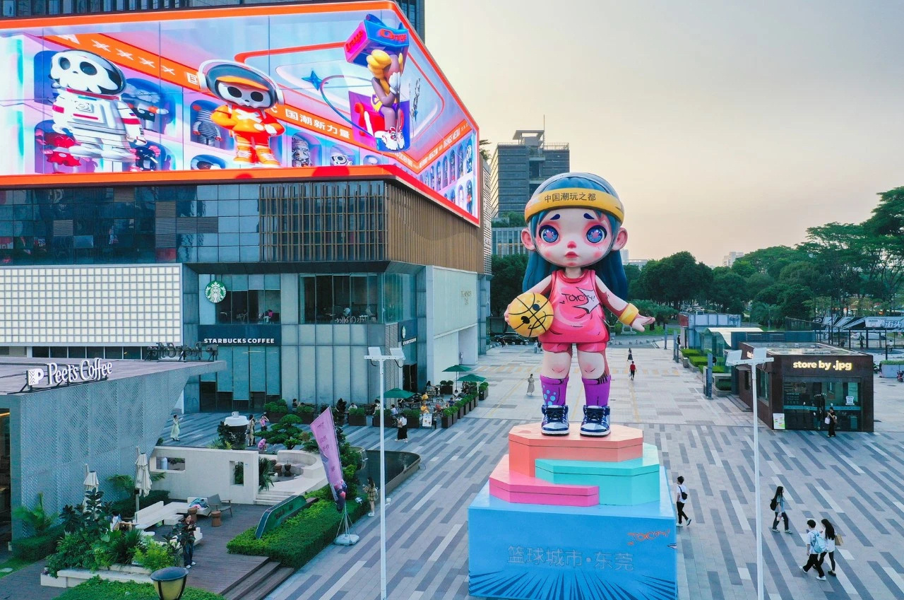 东莞市中心,东谈主潮倾盆处,一座超大潮玩雕琢“劳拉(LAURA)”兀立于此。总高度达12米的“劳拉”疑望着东莞大路,身着篮球运动服,把东莞两大文化柬帖——“篮球”和“潮玩”结合起来,展示这座平均年齿惟一33岁的芳华城市的活力。